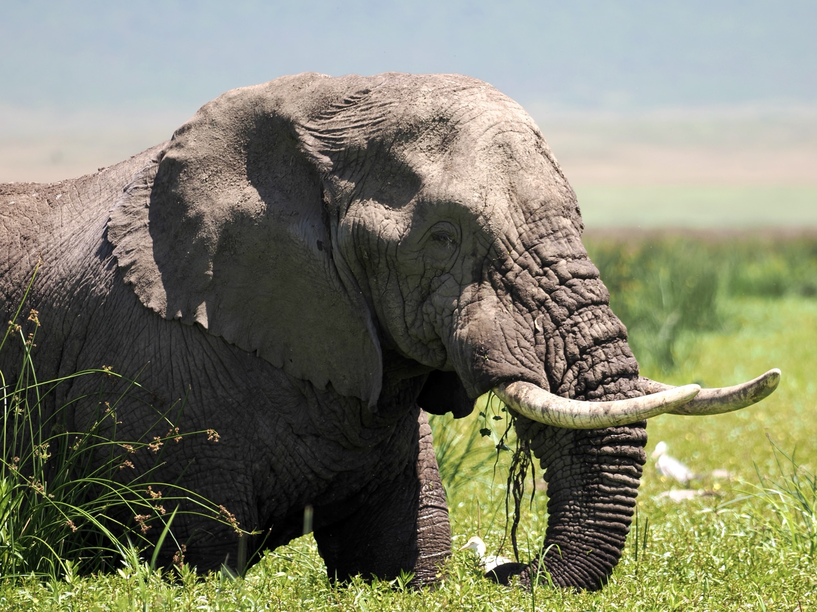 1131アフリカゾウ雄が食事中に、鳥がどんどん飛んでくる