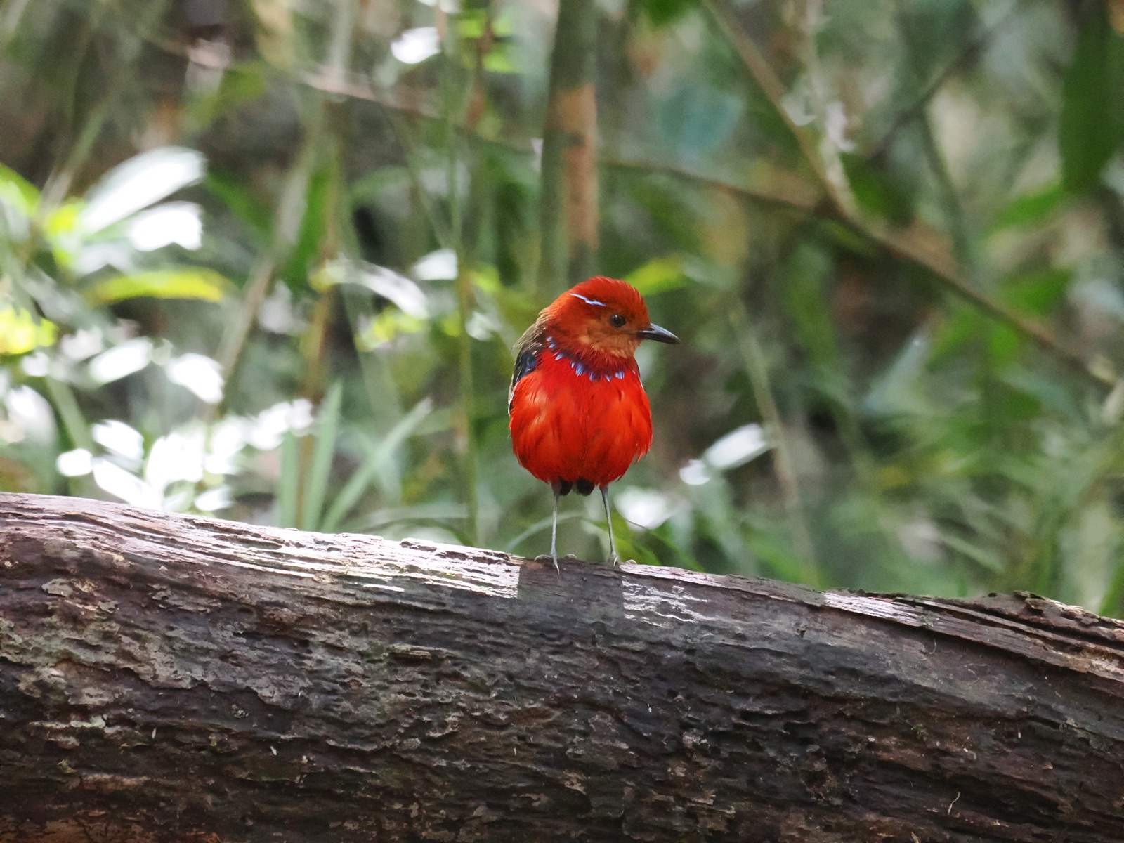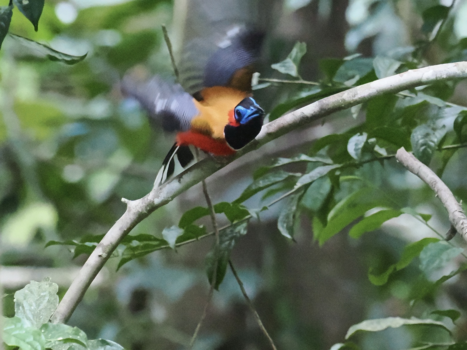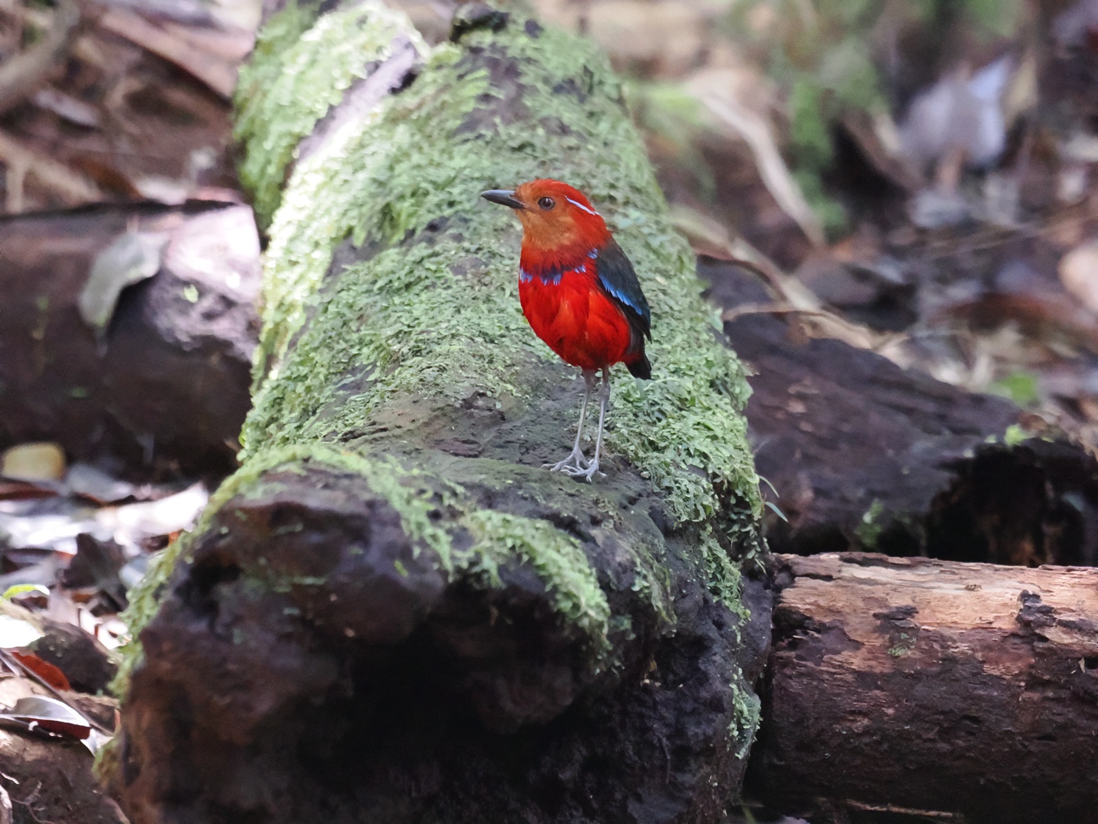 Blue Banded Pittaは、暗いところ、急な山坂、小川が好き。ハイドに到着して早い時間に鳴き声がしたけど遠くに行ってしまいダメかと思ったけど午後に帰ってきたとハイドを出た後で説明される。私たちの前3日間は来なかった。そしてその前2週間も来てなかった。と後から聞かされる。普段は1分位しかいないというから、どんだけラッキーだったのかと思う。一般的には2日間ここのハイドに入ることを推奨しているともあとから言われる。今回は予定していた場所のハイドが許可の問題で入れず、急遽スケジュールを変えての訪問でやっと1日だけ来たのだが、それで出会えて本当にラッキーで、ほっとした瞬間。赤い宝石のアオオビヤイロチョウ、充実した出会いの時間でした