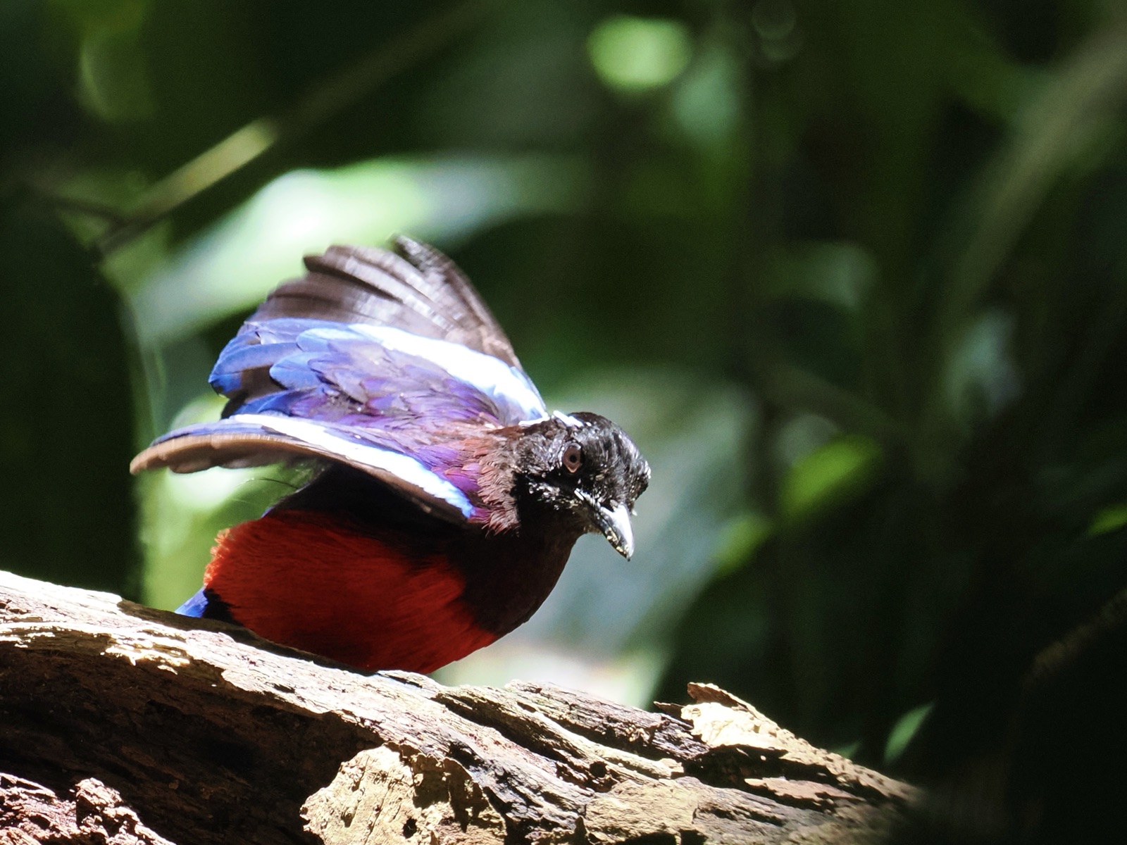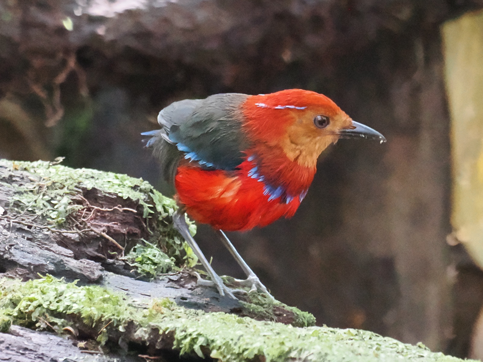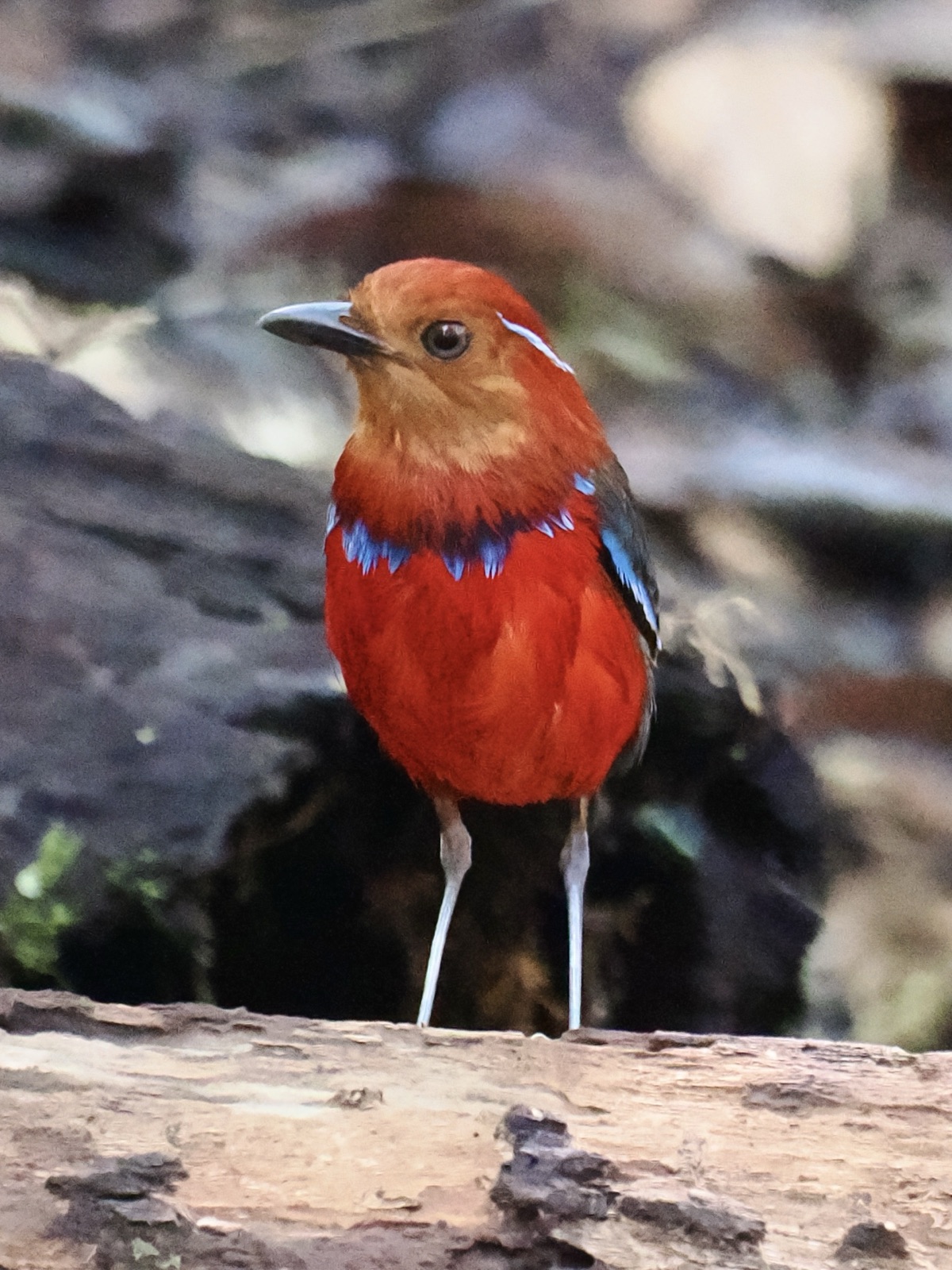 Blue Banded Pittaは、暗いところ、急な山坂、小川が好き。ハイドに到着して早い時間に鳴き声がしたけど遠くに行ってしまいダメかと思ったけど午後に帰ってきたとハイドを出た後で説明される。私たちの前3日間は来なかった。そしてその前2週間も来てなかった。と後から聞かされる。普段は1分位しかいないというから、どんだけラッキーだったのかと思う。一般的には2日間ここのハイドに入ることを推奨しているともあとから言われる。今回は予定していた場所のハイドが許可の問題で入れず、急遽スケジュールを変えての訪問でやっと1日だけ来たのだが、それで出会えて本当にラッキーで、ほっとした瞬間。赤い宝石のアオオビヤイロチョウ、充実した出会いの時間でした
