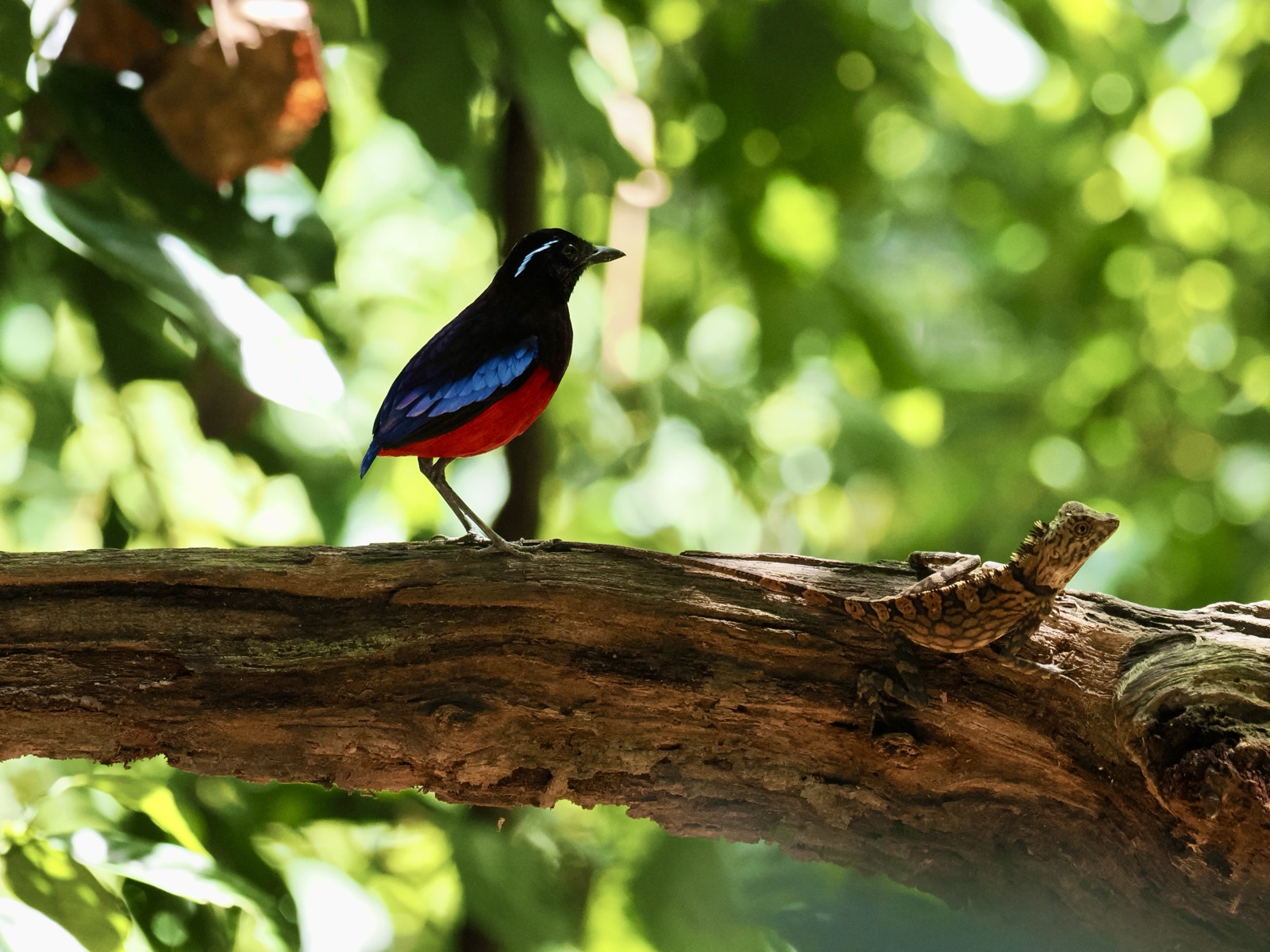 タワーで鳥見中のガイドとの会話:オニヤイロチョウがキナバタンガンのハイドに今朝7時に来たと写真を見せてもらう。今日もし私たちが帰国しない日なら予定を変えてキナバタンガンのハイドに行けばオニヤイロチョウに会えるチャンスが高いよと。一回でたら数日、最大4日くる。そして2週間来ない。1ヶ月に最大8日間チャンスがある鳥。オニヤイロチョウが、世界で最も見るのが難しいヤイロチョウで、今やこれが見たくて飛行機で飛んでくる人もいる。明日はそんなお金持ちバーダーでハイドがいっぱいになるけど、今すぐ動ける人は少ないから今日なら入れると、朝からクレイジーバーダーな話しで盛り上がる。以下は帰国後に確認。ヤイロチョウの仲間は、主にアジア、オーストラリア、アフリカの熱帯地域に分布。ヤイロチョウ科は全32種。分類学的に長年再編が続いており、以前は全てPitta属にまとめられていましたが、現在は3属に分かれ、Pitta(ピッタ)属13種、Hydrornis(ヒドロルニス)属9種、Erythropitta(エリスロピッタ)属10種(2024年IOC分類に基づく)。