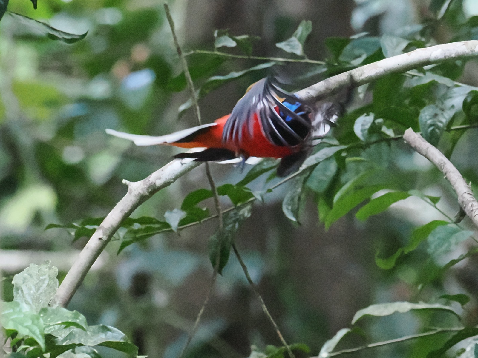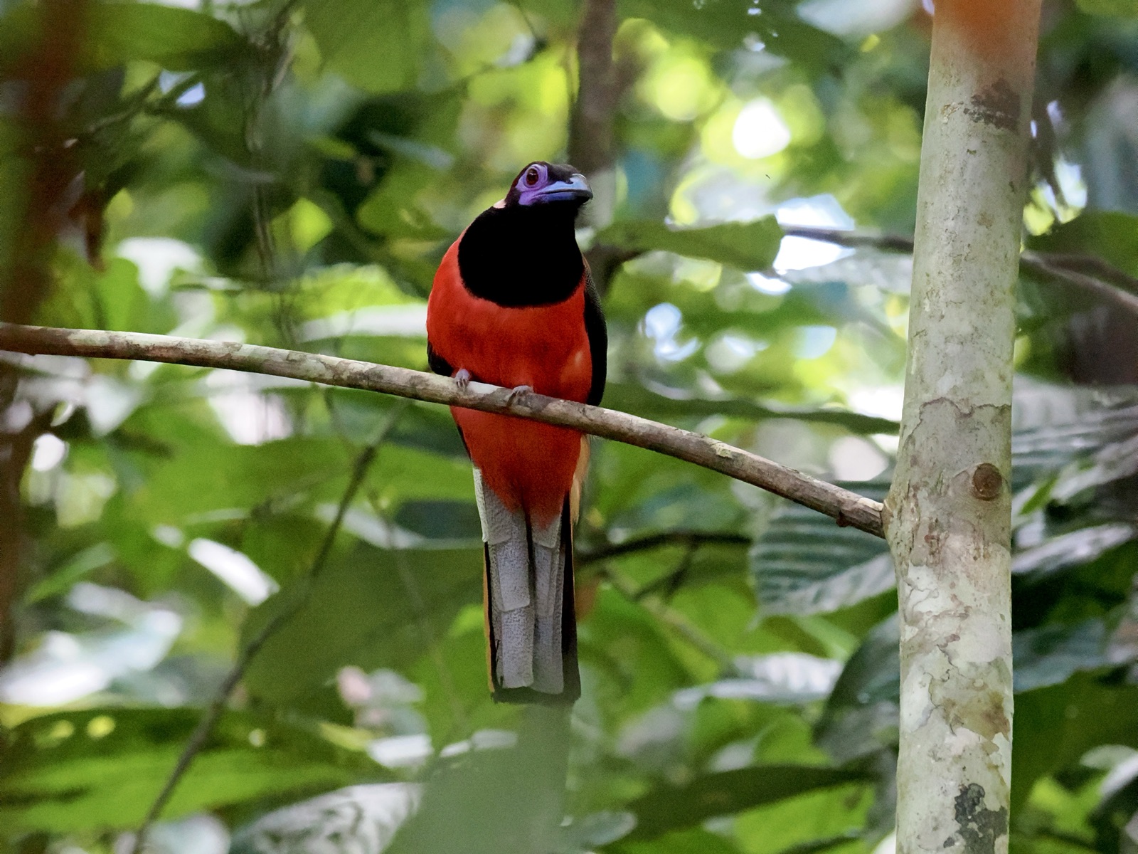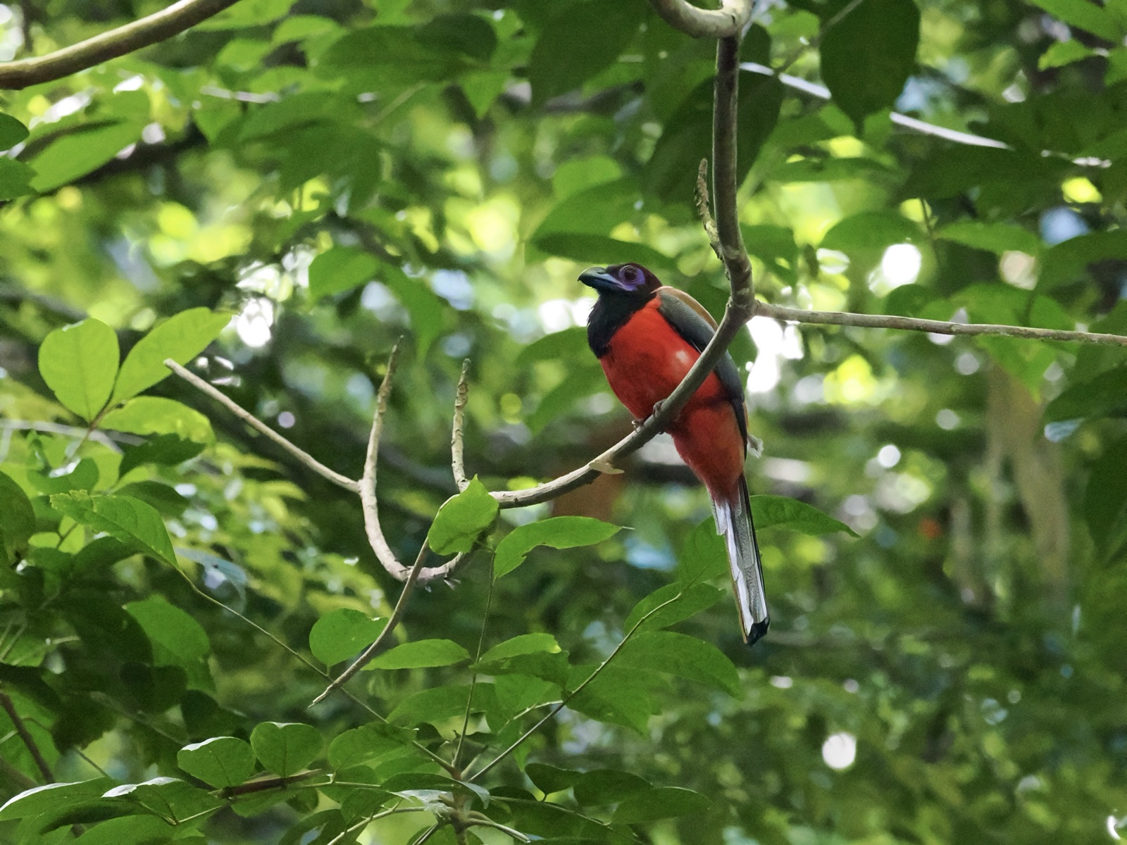 0955 バラエリキヌバネドリ雄188-1 Diard’s Trogon 森の中を歩いてすすでいたら、枝の上にわかりやすく派手に座っていた