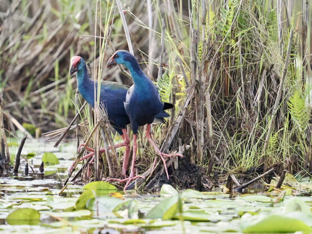 ハシビロコウの観察だが、初日に出会ったのは成鳥と幼鳥の個体だった。舟で距離を詰めると成鳥はすぐに飛び立ち、再度近づいた際も同様に飛翔した。警戒心は決して低くない。一方でその後にあとの幼鳥は対照的で、舟を止めてしばらく遠くから観察していたら、こちらに近づいてくる場面があった。大型の体を持ちながらも動きには幼さが残り、じっとしていない。私の飼っているレオパの様な餌を見つけた時に3回くらいに分けて顔を少しずつ近づける様な仕草をしたので、一瞬、爬虫類に見えた。その後、成鳥個体も観察し、個体差かもしれないが、落ち着きが少ない年齢差による行動の違いを明確に感じた。