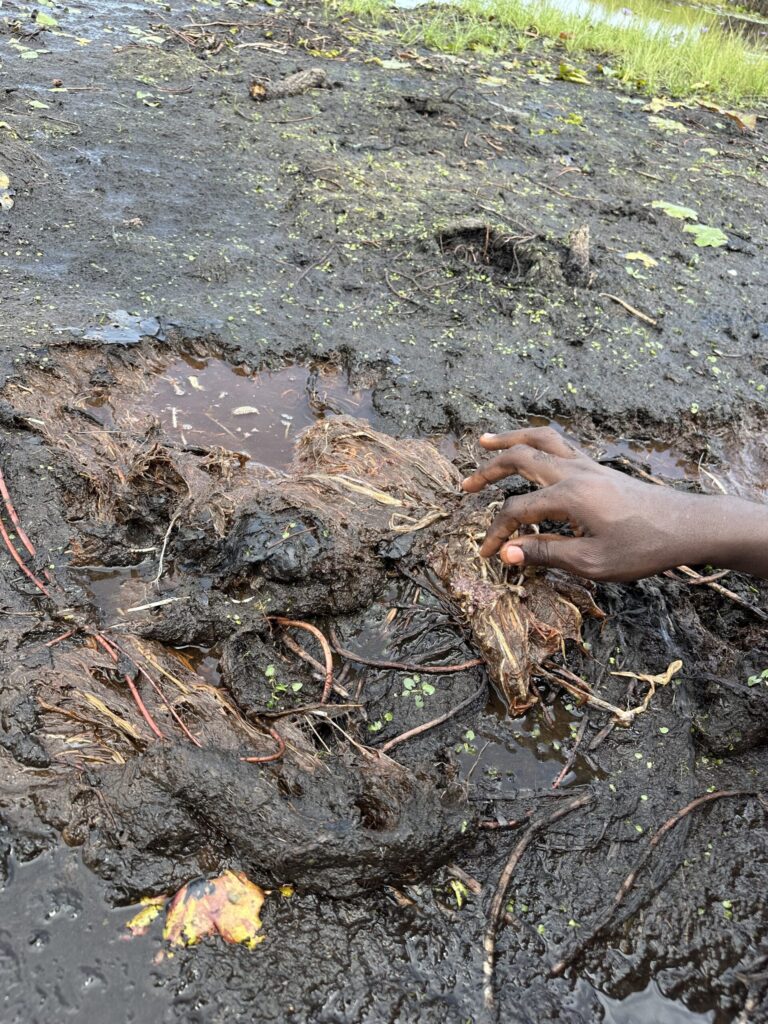 湿地の泥に触れたとき、最初に感じたのは硬さだった。表面は柔らかく見えるが内部は思っていたよりもずっとしっかりしていた。植物の根は太く発達し、湿原という環境を支える構造が存在していることが分かった。掘り返してみると、ミミズの糞のようにも見える色の異なる土壌が現れた。生物の活動痕であることは明らかだったが、直接個体は確認できなかった。水中・泥中・陸上の境界が連続している生態系であることを実感した。