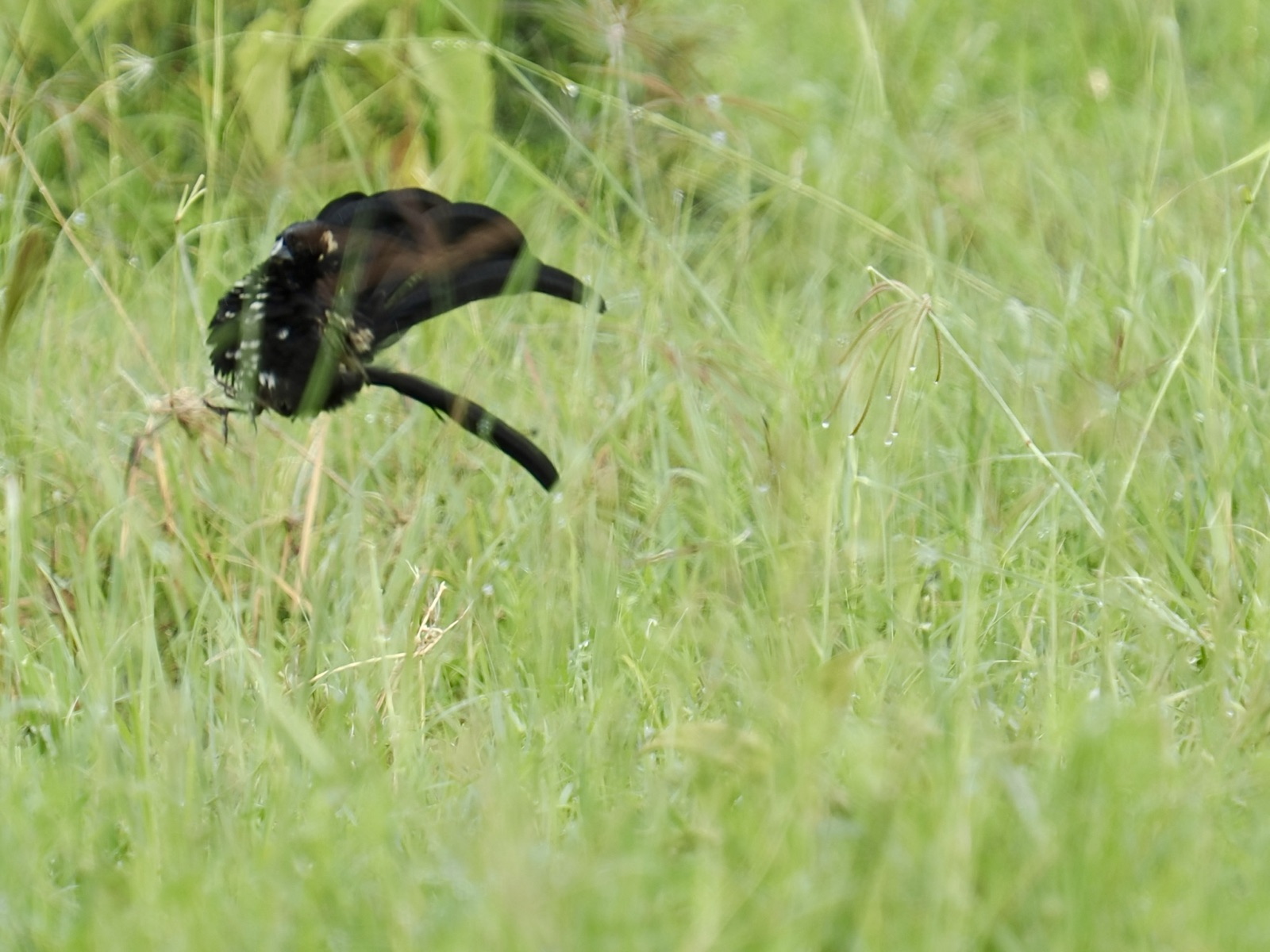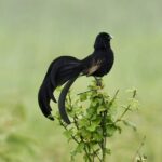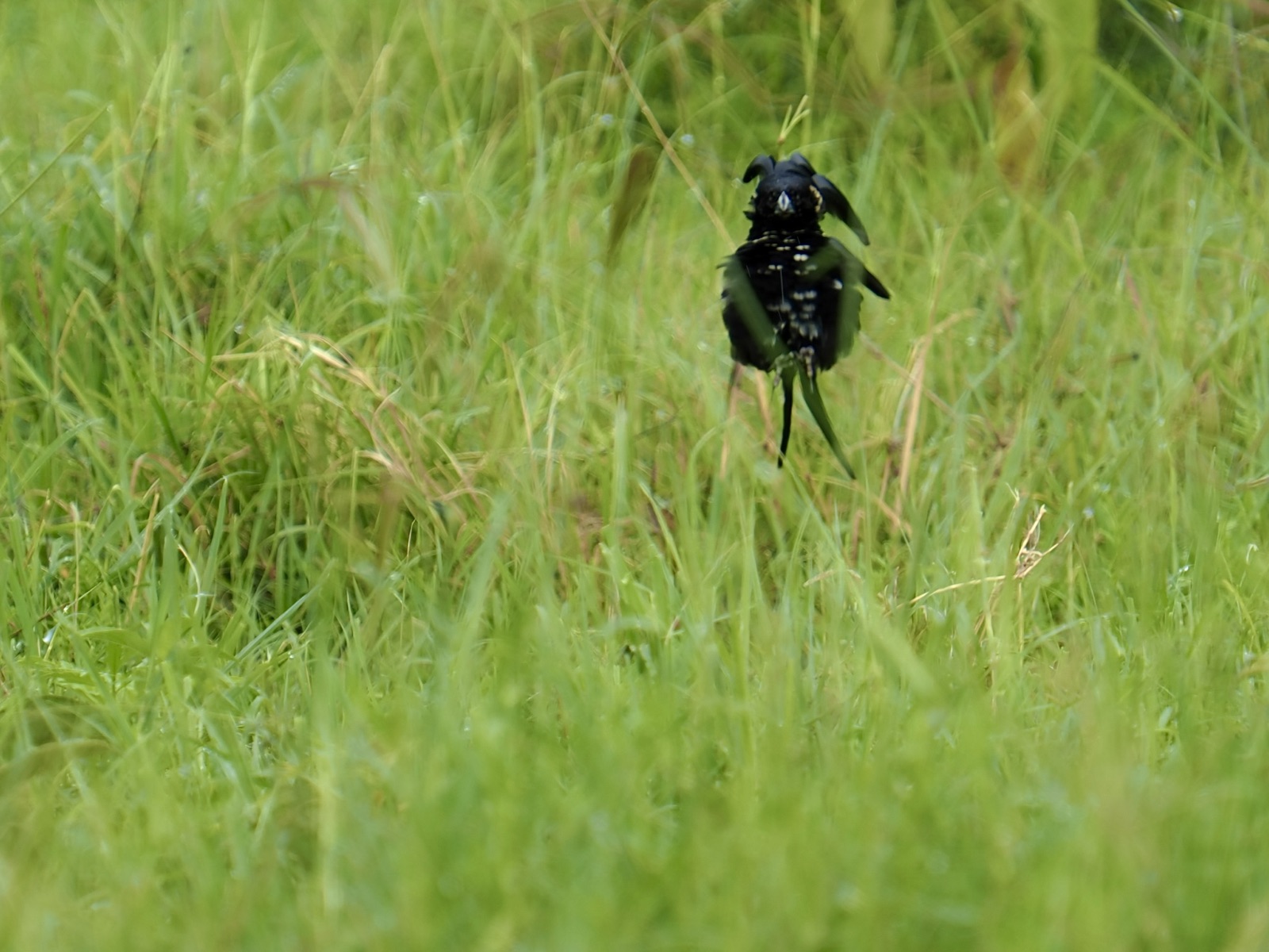 繁殖期には、普段はメスと変わらないような茶色い羽が、黒く長くゴージャスに変化し完全に「見せるための体」になっていた。